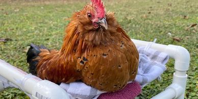 Leo the Rooster was found injured on his prior owner's property. Unable to walk and needed 24 hour care, we gladly accepted Leo into the sanctuary in January 2021. With a special "chair" made for him, Leo enjoyed staying on the porch "talking" to the other chickens that live on the property. Sadly, Leo's health began to fail and he left us in February 2021.